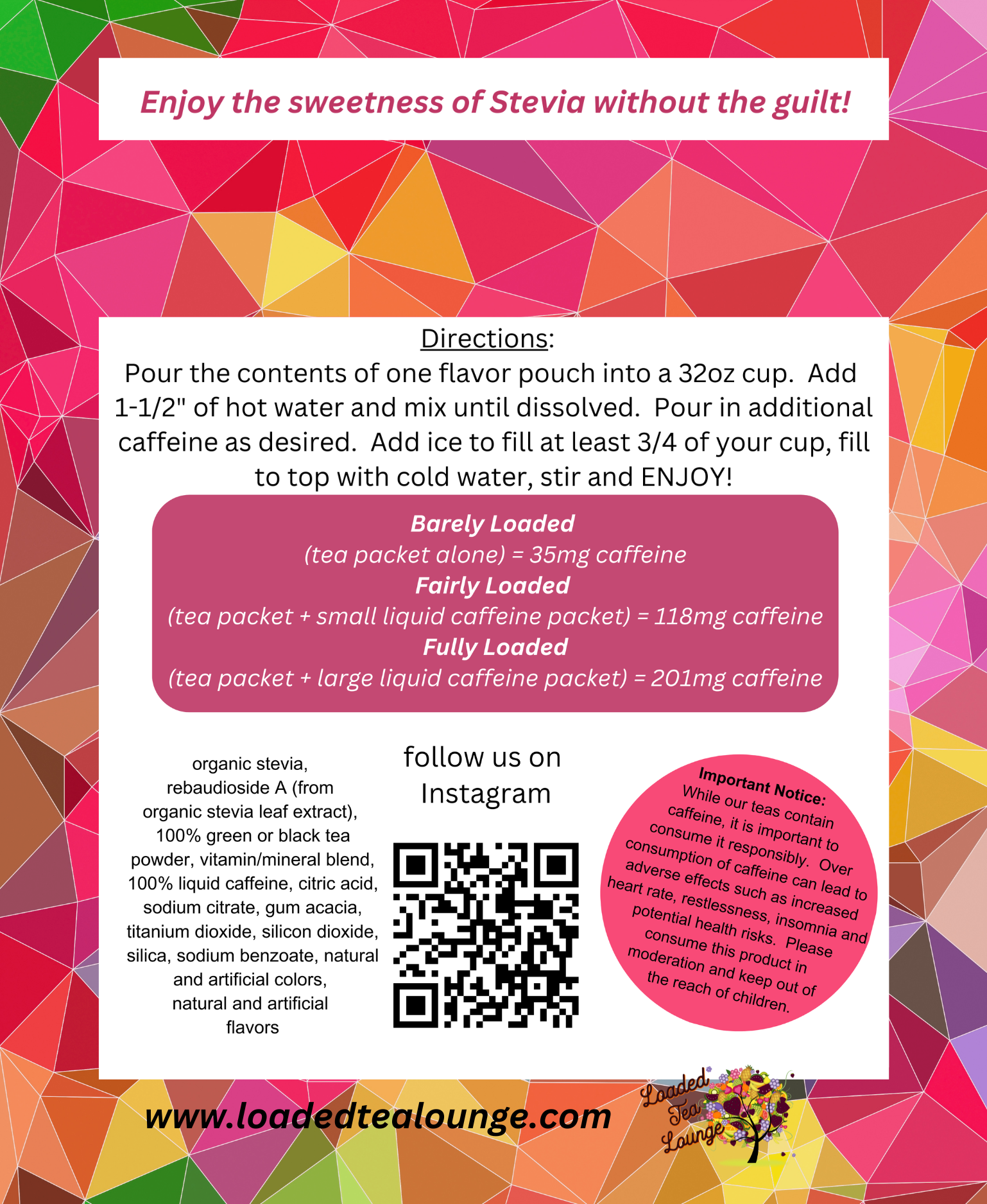 Get energized with our loaded tea! Our teas are sweetened with natural stevia ONLY, no sucralose or aspartame. You chose your caffeine level, no need to be stuck at high caffeine when its not that kind of day. Feel the energy without the loss of hydration with our added vitamin and mineral supplement! Enjoy Loaded Teas in a more cost-effective way than visiting a brick and mortar shop.
