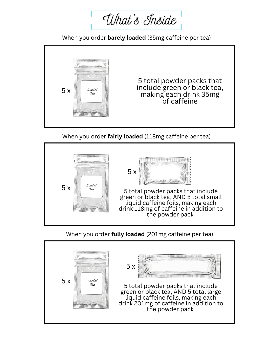 You can chose your own caffeine level per 5-Pack: Barely Loaded: 35mg caffeine (comes from the tea only), Fairly Loaded: 118mg caffeine (1 small liquid caffeine packet), Fully Loaded: 201mg caffeine (1 large liquid caffeine packet)