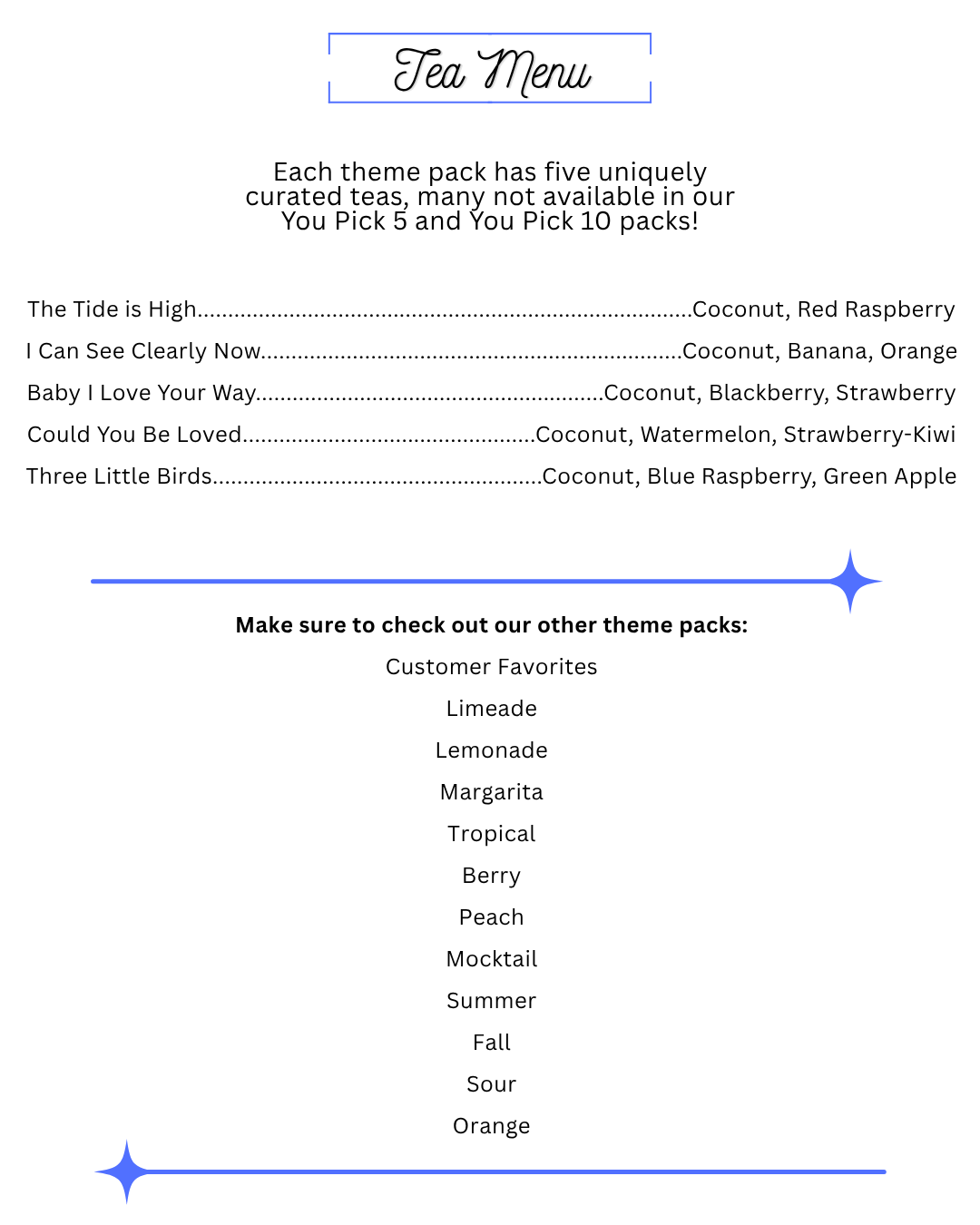 5-Pack Flavors Include: Three Little Birds (coconut, blue raspberry, green apple), Could You Be Loved (coconut, watermelon, strawberry-kiwi), Baby I Love Your Way (coconut, blackberry, strawberry), I Can See Clearly Now (coconut, orange, banana), The Tide is High (coconut, red raspberry)