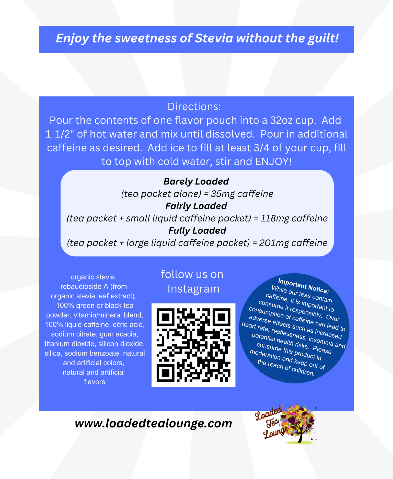 Get energized with our loaded tea to go packs! Our teas are sweetened with natural stevia ONLY, no sucralose or aspartame. You chose your caffeine level, no need to be stuck at high caffeine when its not that kind of day. Feel the energy without the loss of hydration with our added vitamin and mineral supplement! Enjoy Loaded Teas in a more cost-effective way than visiting a brick and mortar shop.